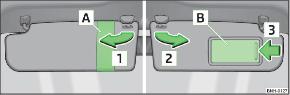 In der Sonnenblende für den Beifahrer befindet sich ein Make-up-Spiegel B mit einer Abdeckung. Die Abdeckung in Pfeilrichtung 3 schieben.